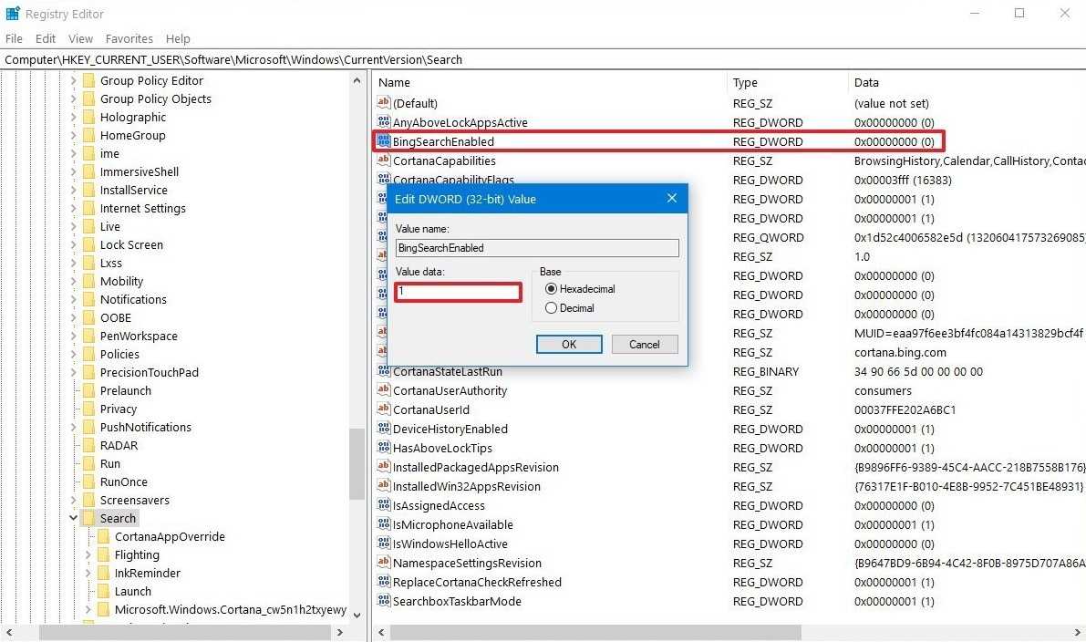 - Создаем параметр BingSearchEnabled и оставляем для него значение 0.