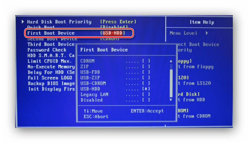 - Производим загрузку системы с диска для установки или загрузочной флешки (урок по созданию такого носителя был приведен в предыдущем способе). Настраиваем BIOS так, чтобы загрузка производилась с флеш-накопителя или привода CD/DVD (устанавливаем в пункте «First Boot Device» параметр «USB-HDD» или «СDROM»).