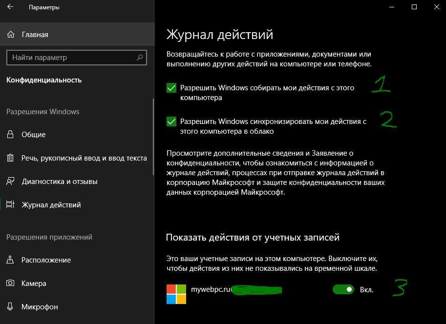 - «Разрешить Windows собрать мои действия с этого компьютера»