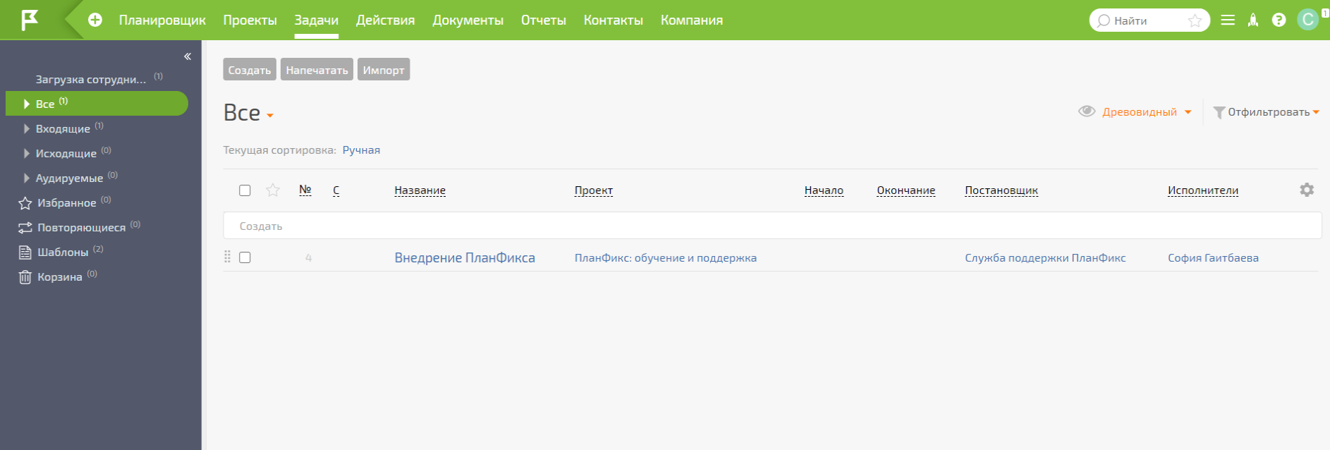 В Planfix есть восемь разделов: