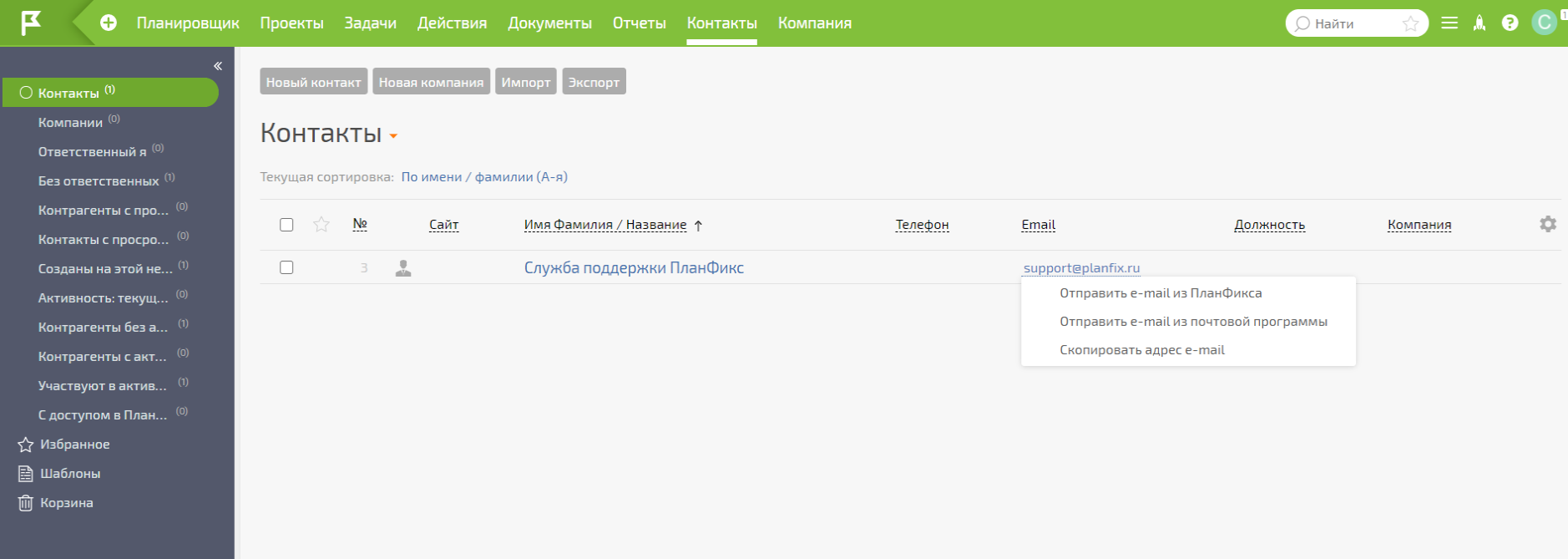 В Planfix также удобно хранить информацию о клиентах, фильтровать их, объединять в группы, словом, использовать как CRM-систему. Общаться с клиентами и сотрудниками можно прямо из интерфейса системы, кликнув на телефон или адрес электронной почты.
