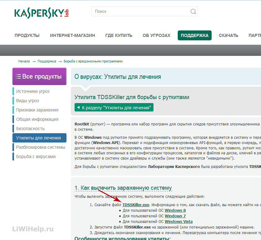 А как известно, rootkit в первую очередь попадает на компьютер пользователя, используя уязвимости браузеров или плагинов. Поиск утилиты для борьбы с руткитами я начал, конечно же, на сайте Лаборатории Касперского и на нём свой поиск закончил, так как необходимый инструмент под названием «TDSSKiller» был найден сразу.