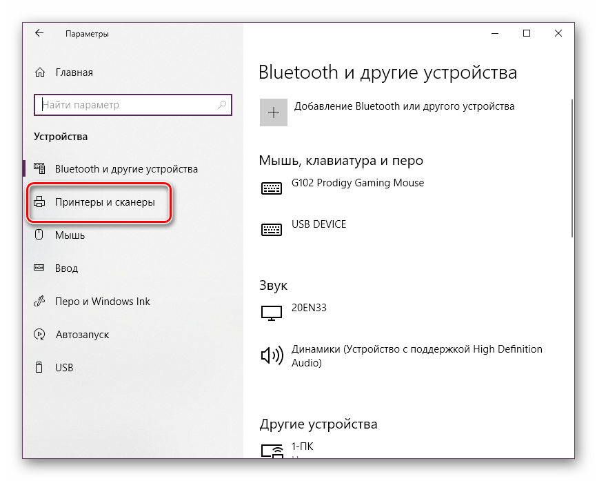 В окне параметров переходите по пунктам «Устройства», «Принтеры и сканеры». Справа выбираете нужный аппарат, кликаете на него и переходите в «Управление», где будет аналогичная функция.