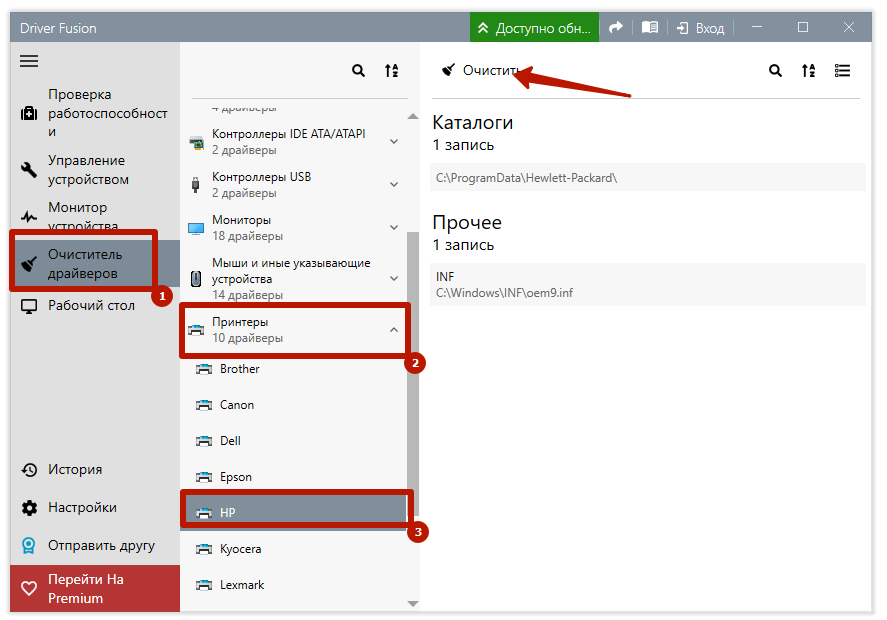 После установки следует зайти в меню «Очиститель драйверов», затем в «Принтеры». Выбираете фирму-производителя, утилита сразу же просканирует систему на наличие файлов. После, нажмите «Очистить» вверху окна и согласитесь с продолжением очистки.