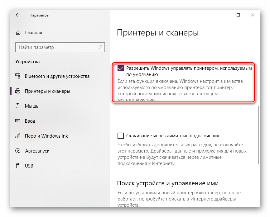 - Откройте вкладку «Принтеры и сканеры», а затем уберите флажок с параметра «Разрешить Windows управлять принтером»;