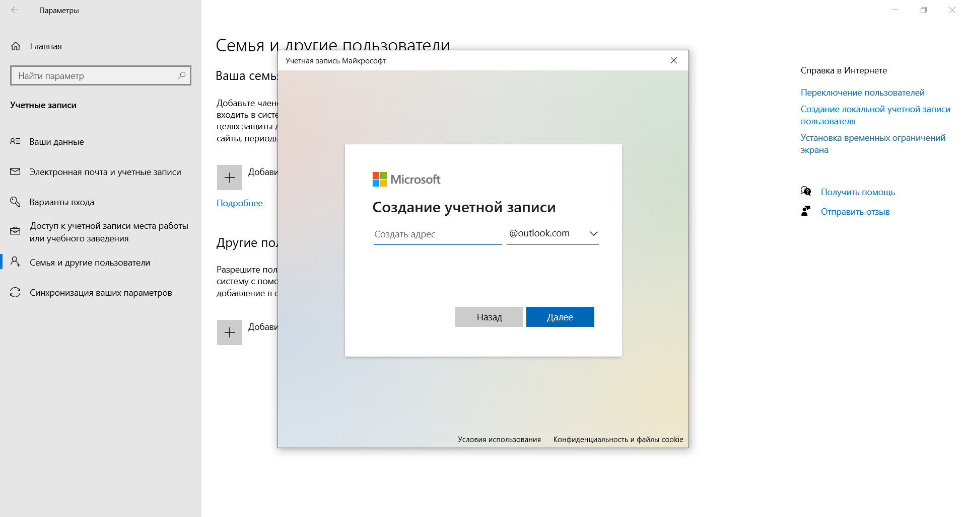 - Выбрать пункт «Учетные записи», в котором нужно перейти в раздел «Семья и другие пользователи».