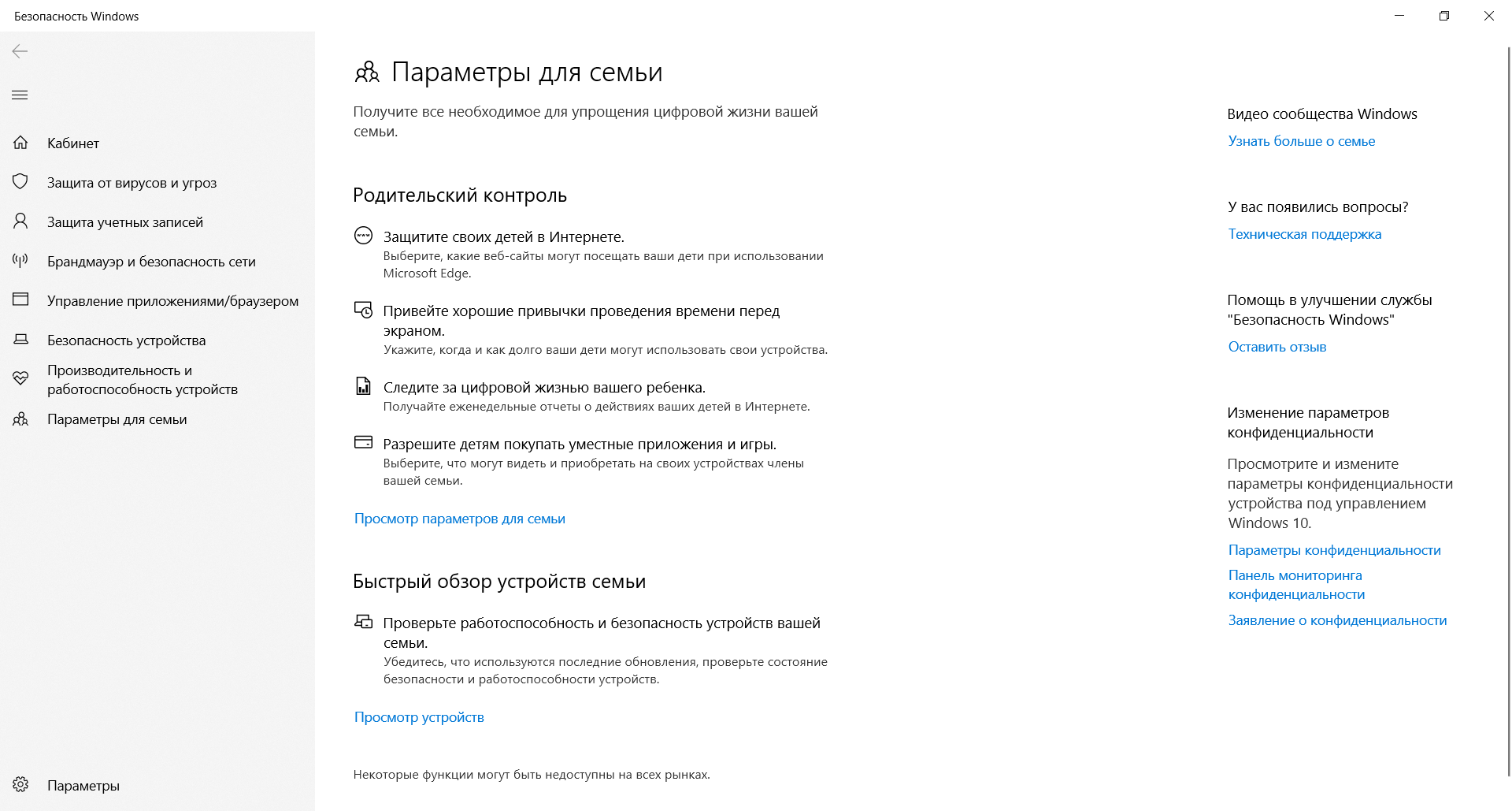 Модуль «Параметры для семьи» доступен, как и предыдущие, через поиск Windows. Это наиболее простой запуск настройки ограничений доступа в сеть для детей. Здесь же имеется доступ к истории посещений, счетчик времени, проведенного в интернете, перечень скачанных приложений, видео и другого мультимедийного контента.