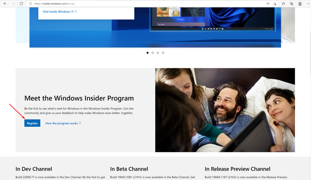 Чтобы присоединиться, нужно зайти на веб-сайт Windows Insider и нажать «Зарегистрироваться».