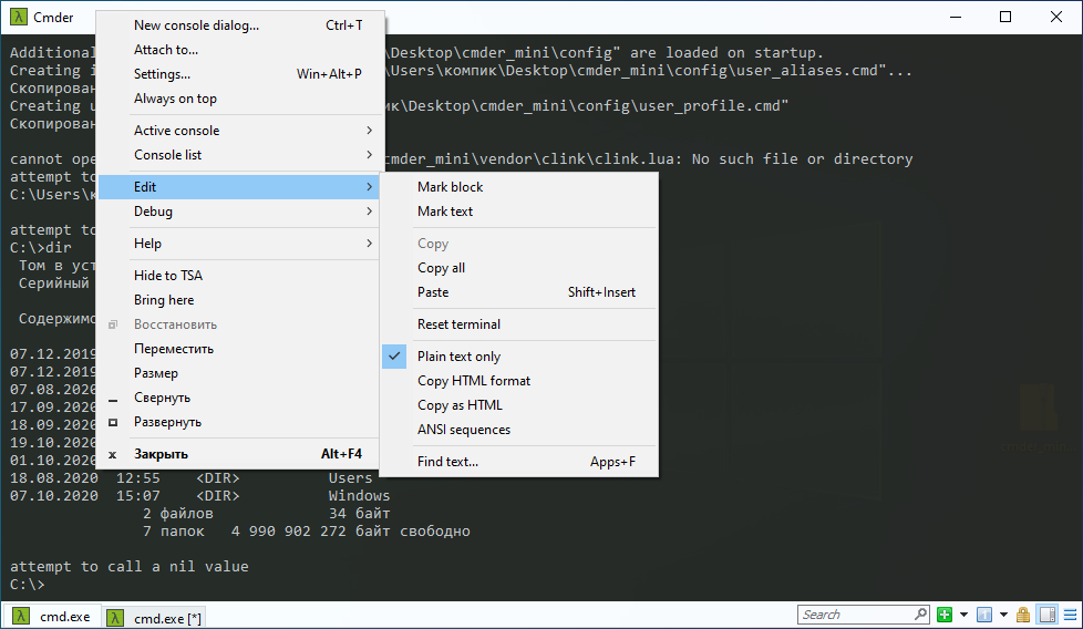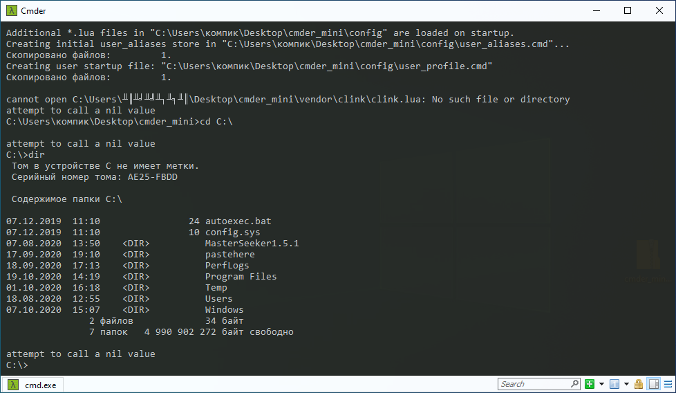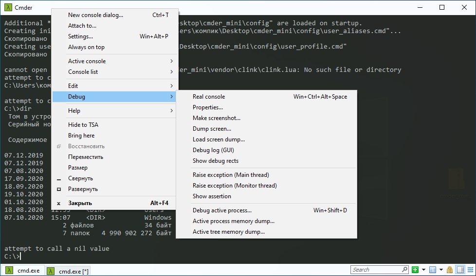 Распространяясь в двух портативных редакциях — Mini и Full, эта альтернатива командой строки на базе ConEmu и расширениями Clink делает упор главным образом на функциональность, более всего близкую к функциональности современных версий PowerShell. Mini-версия Cmder внешне мало чем отличается от стандартной консоли, но имеет несоизмеримо больше настроек.