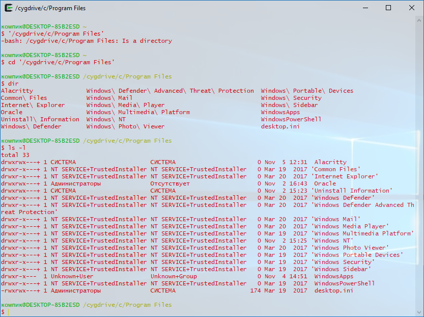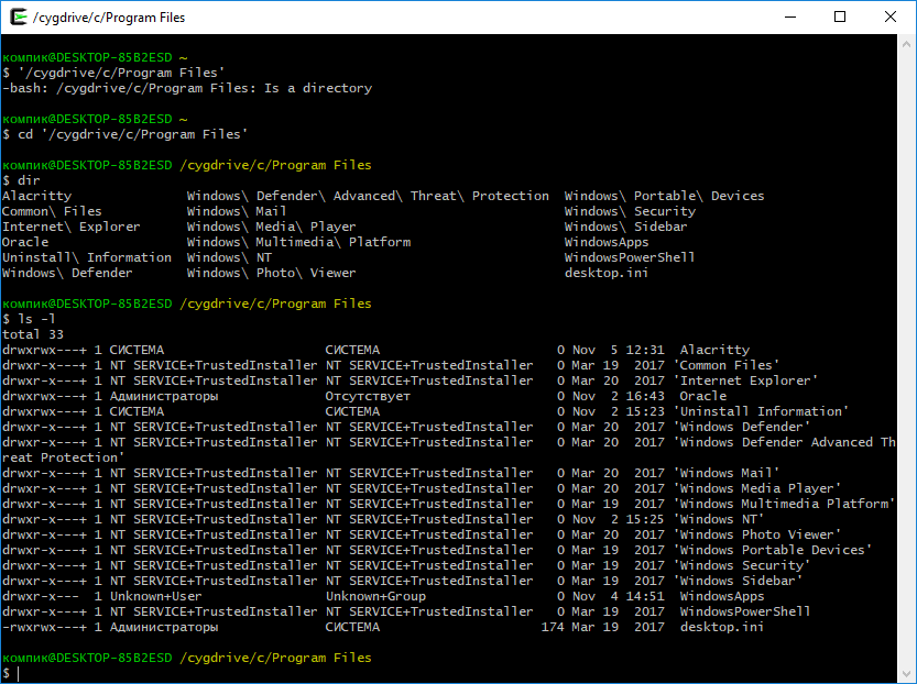 Cygwin в одинаковой мере поддерживает синтаксис Linux- и Windows-интерпретаторов, подключение по SSH, работает с языками программирования C и C++, Perl и Python, Fortran и Gambas, Ruby, CLISP и еще рядом других языков. Внешне терминал мало чем отличается от обычной командной строки, впрочем, отвечающих за настройку внешнего вида опций в нём не в пример больше. «Недостатком» Cygwin является его относительная сложность, поскольку создавался инструмент явно не для начинающих пользователей.