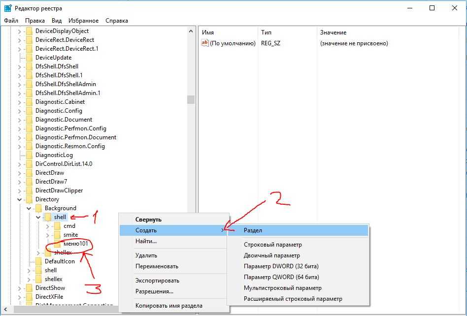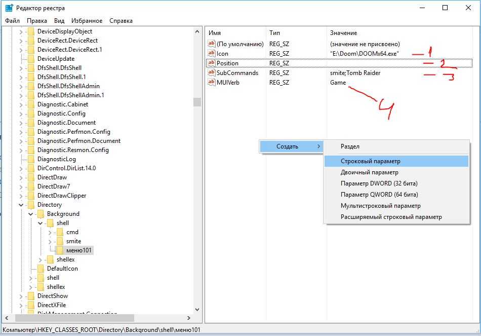 Теперь нужно в реестре создать меню и добавить в него пункты, которые будут служить для вызова команд.