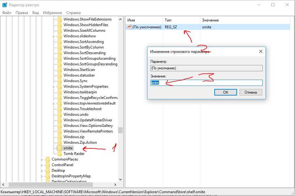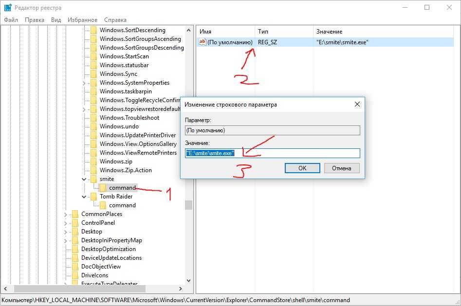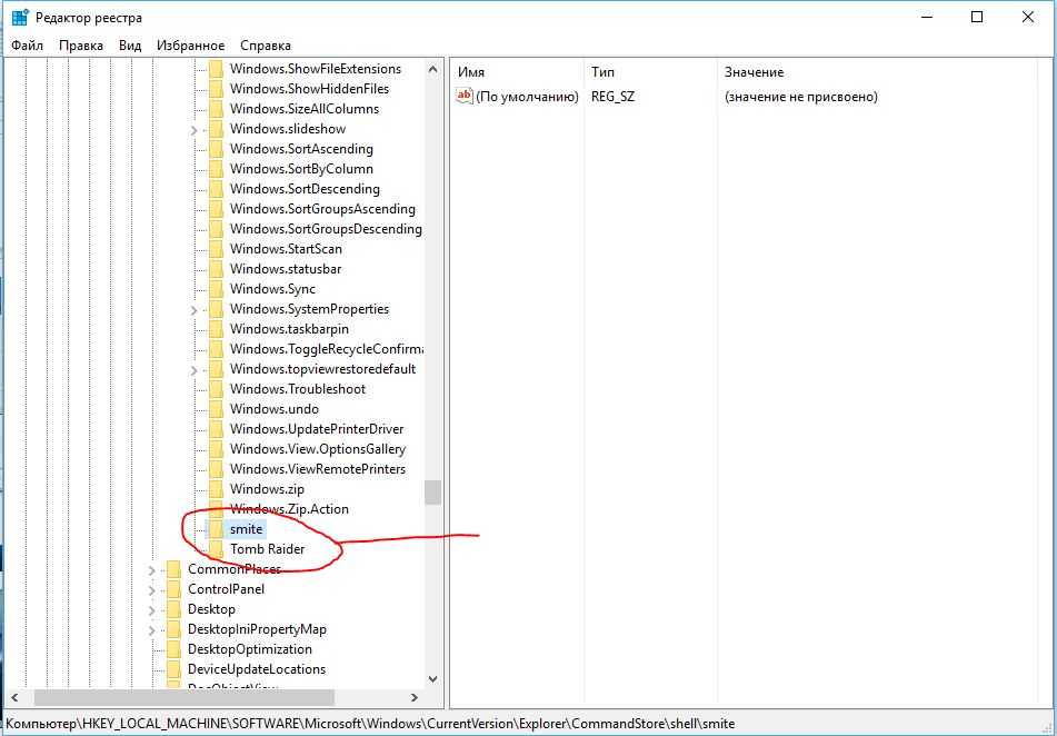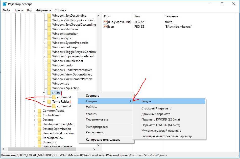 Нажимаем ПКМ на папке shell, создаем разделы, которые задавали в SubCommands (smite;Tomb Raider). Должно получится с лева в столбце две папки с названиями.