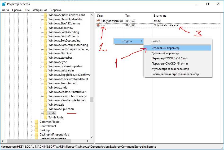 Создаем иконки напротив имен игр. Создаем в smite, Tomb Raider Строковые параметры с именем icon, указанным путем к exe файлу. Напомню что бы скопировать путь. Нажимаем Shift + правый клик на smite.exe, появится «Копировать как путь». . Создаем строковый параметр, указываем путь к игре. Не забываем написать имя icon.