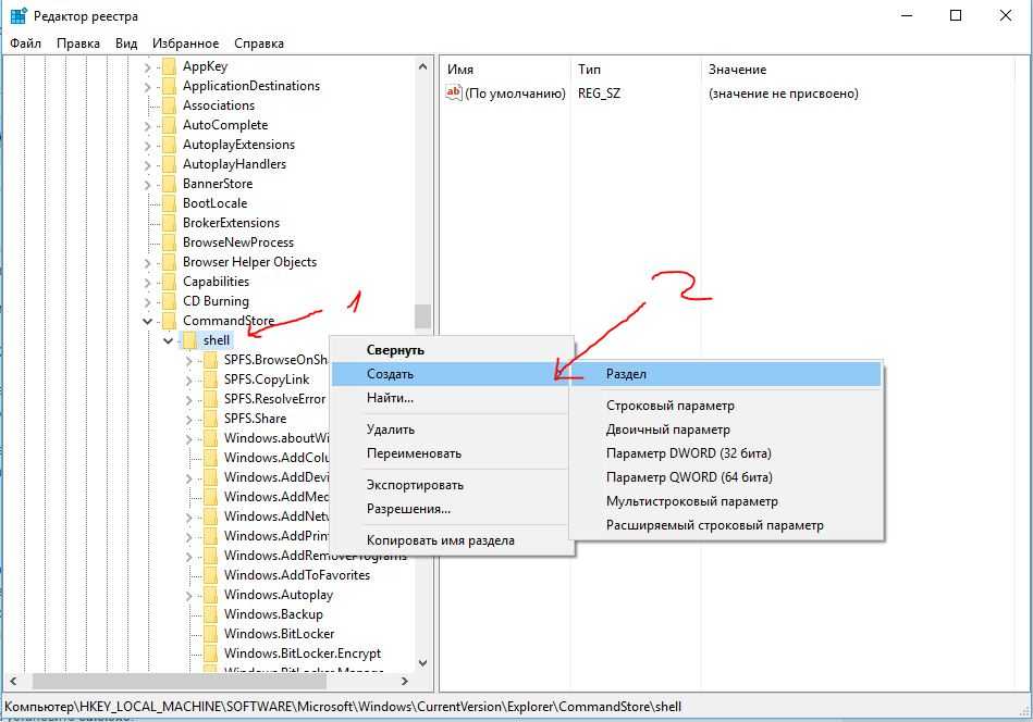 - Щелкните правой кнопкой мыши по разделу shell и выберите пункт Создать – Новый раздел. Имя для раздела можно выбрать любое, но оно обязательно должно быть латинское. Назовите его, например, Menu1. В этом разделе будут созданы следующие строковые параметры.