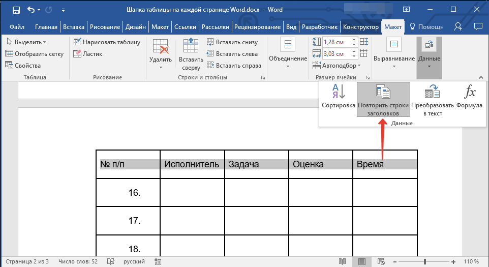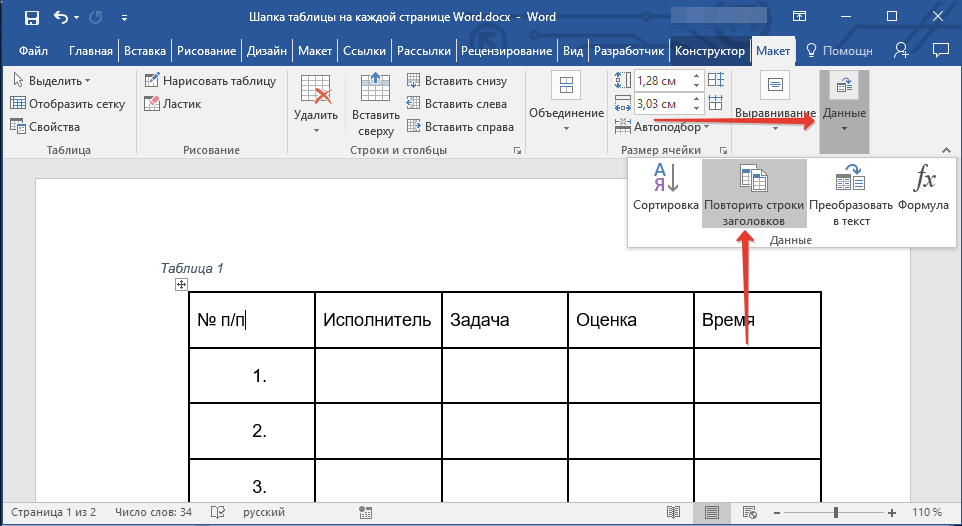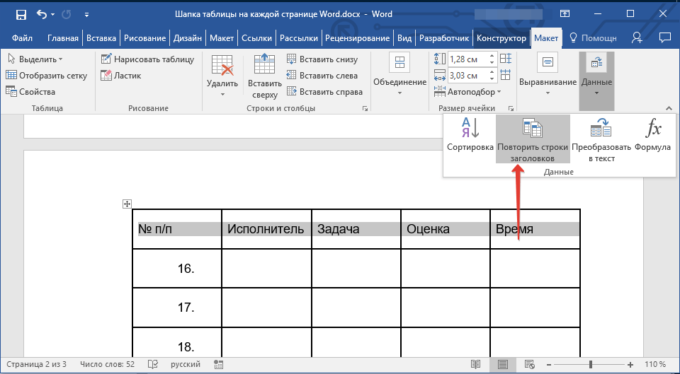 Теперь нужно его продублировать. Выделите добавленную строку, откройте вкладку «Макет» и в группе «Данные» кликните «Повторить строки заголовков» .