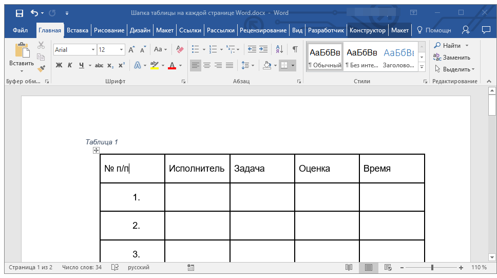 Создание шапки таблицы на каждой странице в MS Word