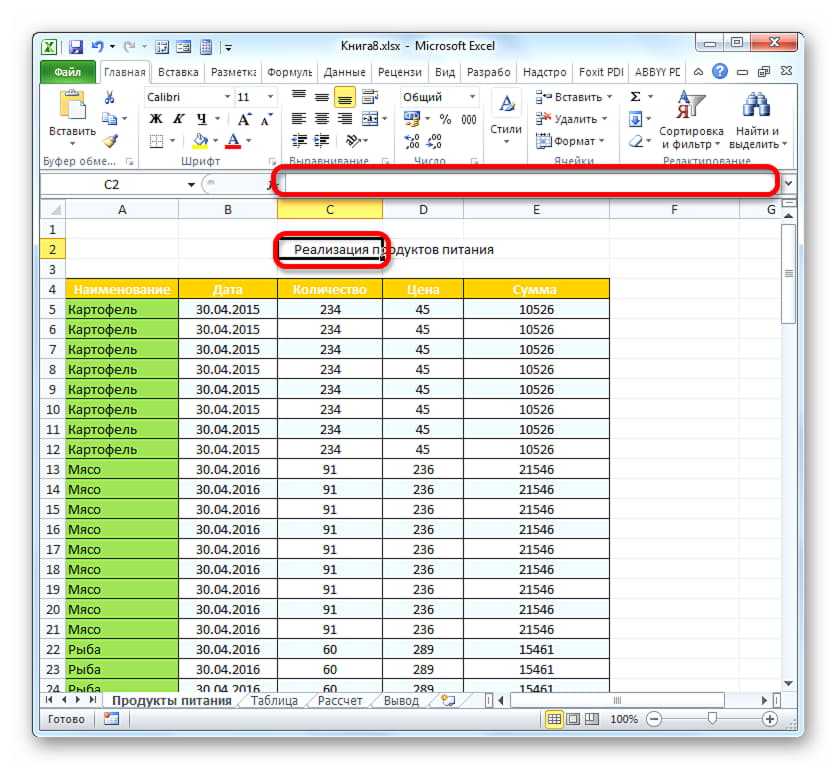 Кликнуть ЛКМ по ячейке, в которой располагается название таблички, чтобы выделить ее. Если после такого клика строка для написания формул будет пустой, то значит заголовок фактически находится в другом месте. Иногда приходится проверять несколько ячеек, чтобы по строке формул понять, в какой из них в действительности отображено название.