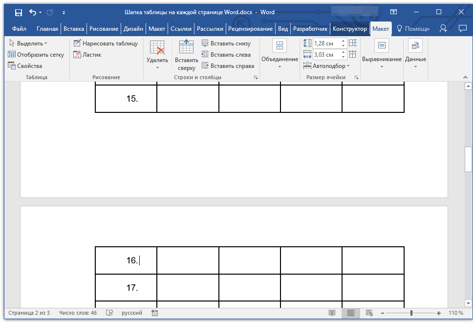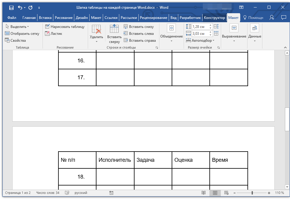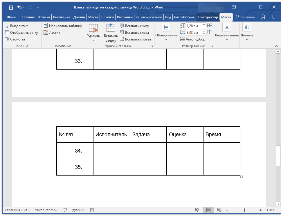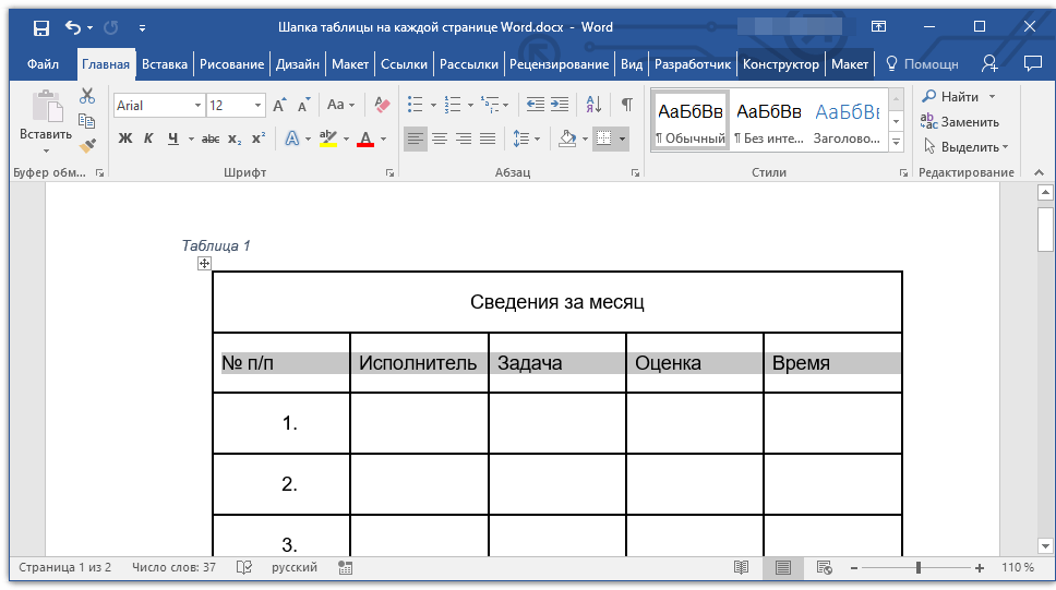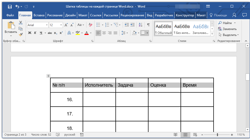 Готово! Теперь основная шапка таблицы, состоящая из нескольких строк, будет отображаться только на первой странице, а добавленная вами строка будет автоматически переносится на все последующие страницы документа, начиная со второй.
