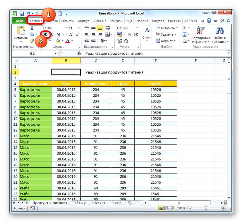 Теперь заголовок не помешает выделить жирным. Для этого надо перейти во вкладку «Главная» и щелкнуть по кнопке «Полужирный».