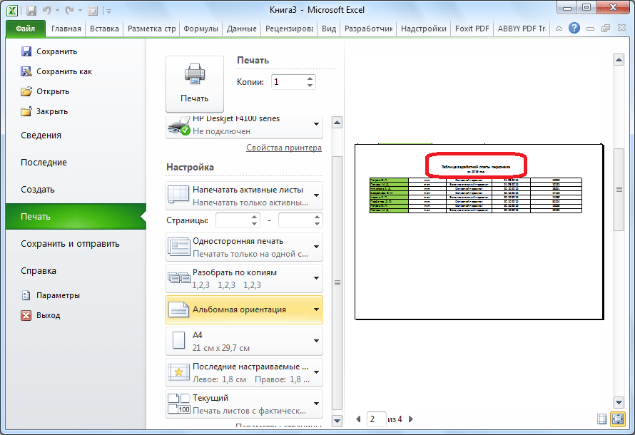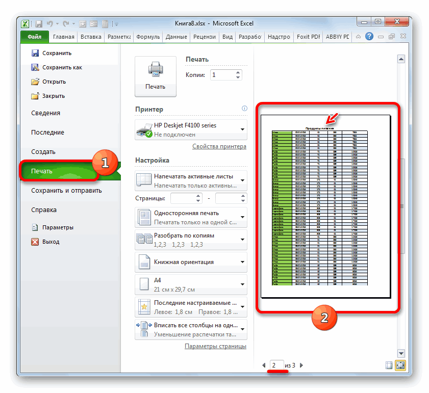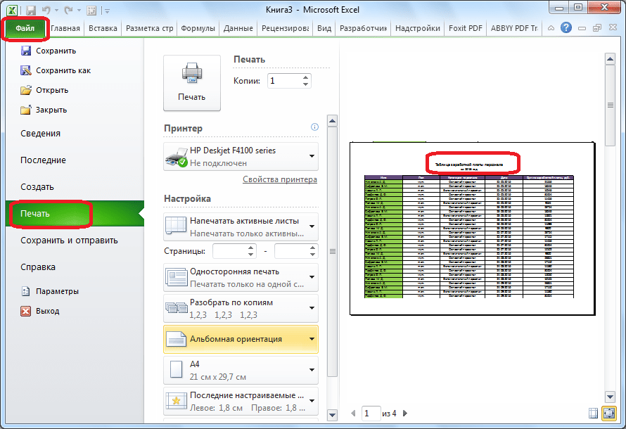 Все нужные действия выполнены, но визуально вы никаких изменений не увидите. Для того, чтобы проверить, действительно ли теперь название таблицы будет печататься на каждом листе, перемещаемся во вкладку «Файл» приложения Excel. Далее, переходим в подраздел «Печать».