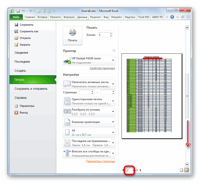 В правой части открывшегося окна размещена область предпросмотра распечатываемого документа. Прокручиваем его вниз, и удостоверяемся, что при распечатке на каждой странице документа будет выводиться закрепленный заголовок.