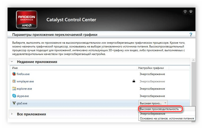 - Выбираем необходимую программу и напротив устанавливаем параметр «Высокая производительность».